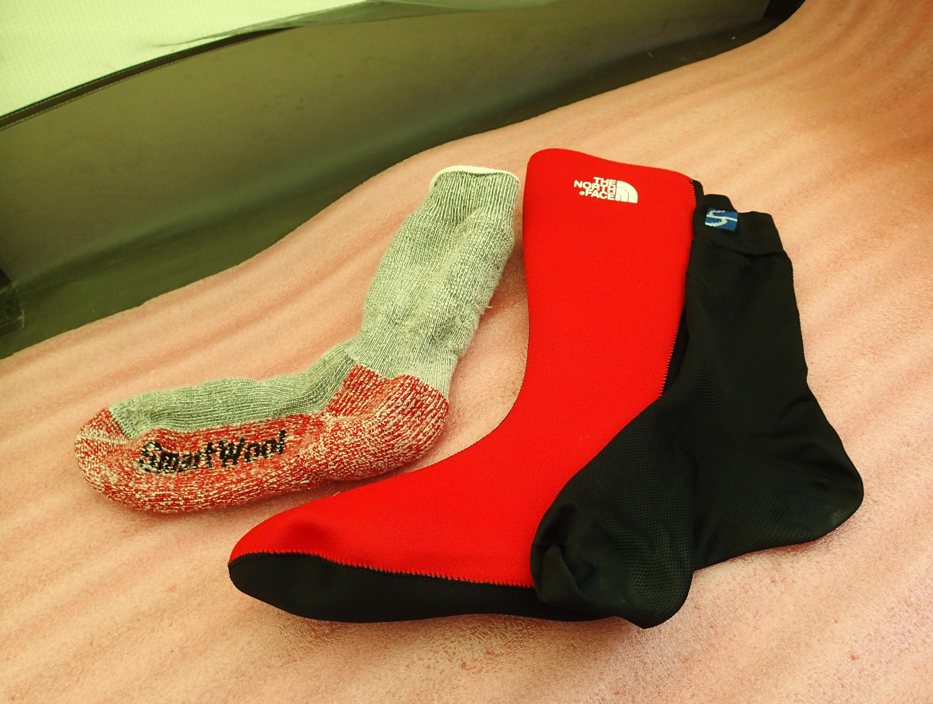 勝負靴下は、ノースフェイスのアルパインソックスとファイントラックのスキンメッシュソックスを重ねて、VBLを作ります。
